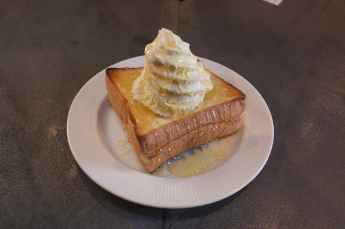 分厚い食パンにたっぷりのバニラアイスをのせてたっぷりのはちみつをかけました。 とってもギルティ。ナイフとフォークで召し上がれ。